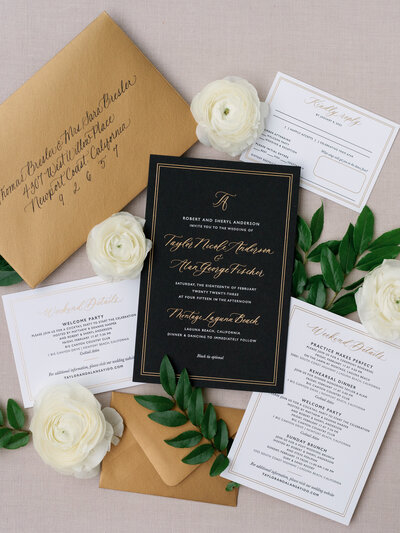 Most clients set aside 5-10% of their total wedding budget for their stationery. Our typical client invests 6,000-15,000 on their custom wedding stationery when factoring in save the date cards, their wedding invitation suite, and day-of stationery and signage. For a lower starting price point, check out our semi-custom line of invitations.